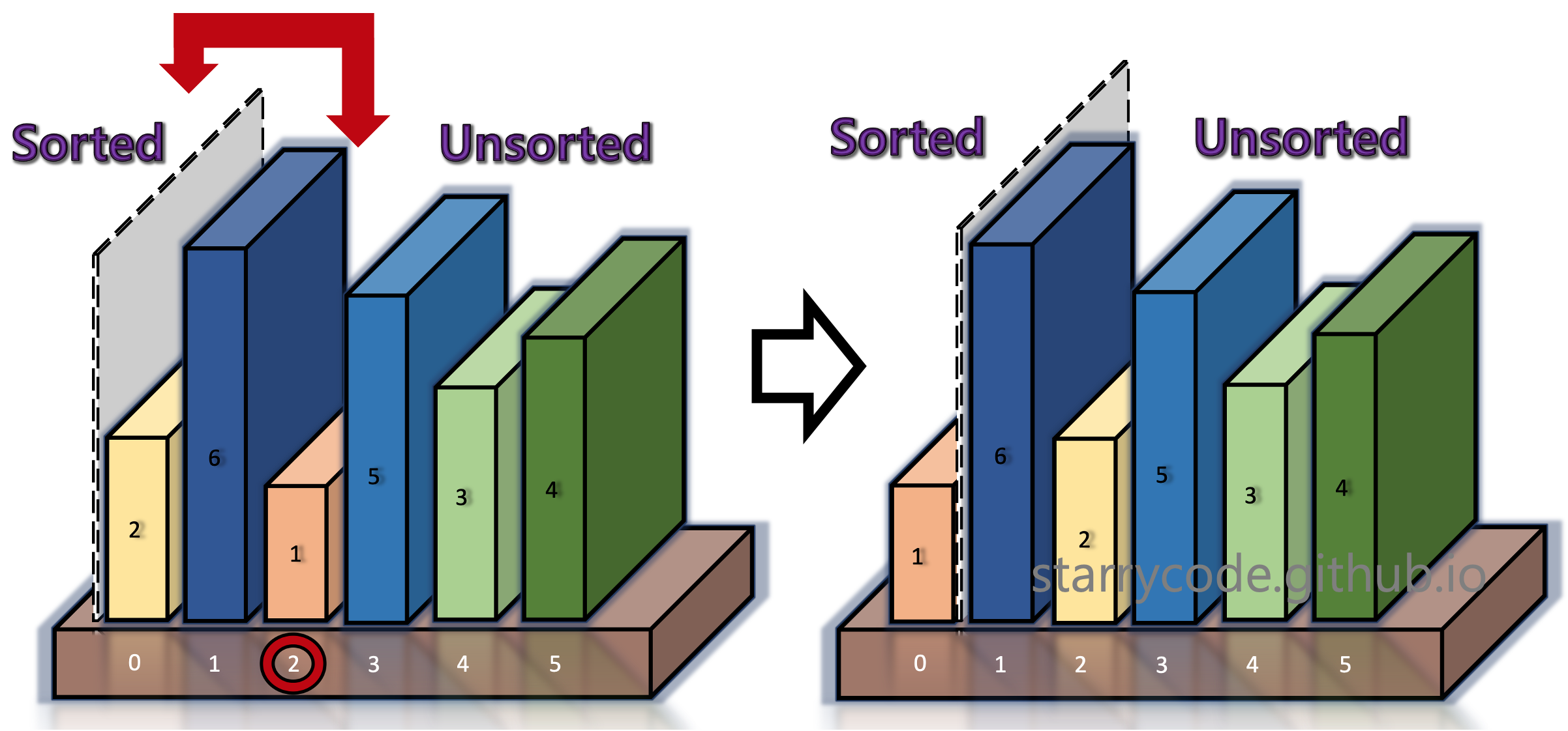 - Ad ogni iterazione, seleziona il minimo dalla parte non ordinata e lo sposta nella parte ordinata.