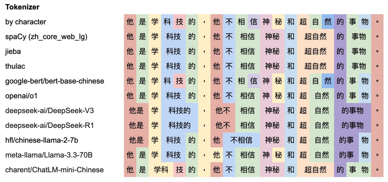 Diversi tipi di tokenizer restituiscono token di lunghezza diversa. La frase tradotta: “Lui è un tipo che crede alla scienza, lui non crede alle questioni misteriose”