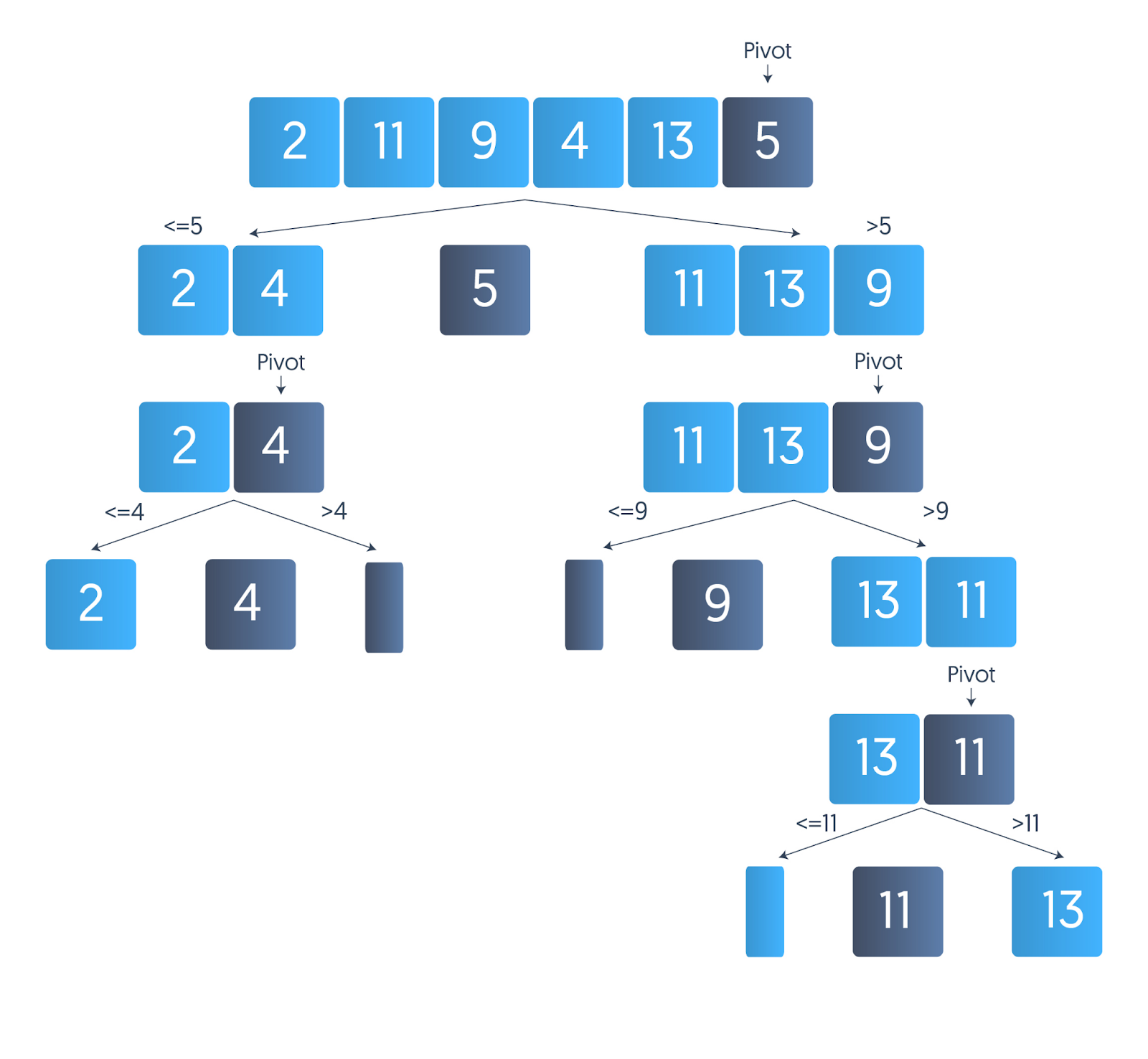 - Sceglie un elemento chiamato “pivot” dalla lista e divide gli altri elementi in due sotto-liste concettuali: una con elementi minori del pivot e una con elementi maggiori.