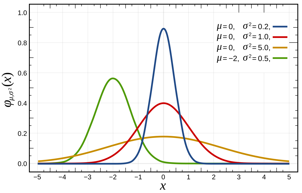 f(x)=1σ2πe−12(x−μσ)2f(x) = \frac{1}{\sigma \sqrt{2\pi}} e^{ -\frac{1}{2} \left( \frac{x - \mu}{\sigma} \right)^2 }