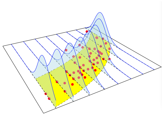 - Le curve a campana blu: Questa è la parte “Generalizzata”. A differenza di un modello lineare classico (che assume che i punti si disperdano secondo una distribuzione Normale con varianza costante attorno al piano), un GLM permette che la distribuzione della risposta appartenga ad altre famiglie (es. Poisson, Binomiale, Gamma). Le curve blu mostrano che per un dato valore dei predittori, il modello non predice un singolo punto sul piano giallo, ma una distribuzione di probabilità di cui il piano giallo rappresenta solo la media. I punti rossi (i dati reali) sono visti come un campione estratto da queste distribuzioni.