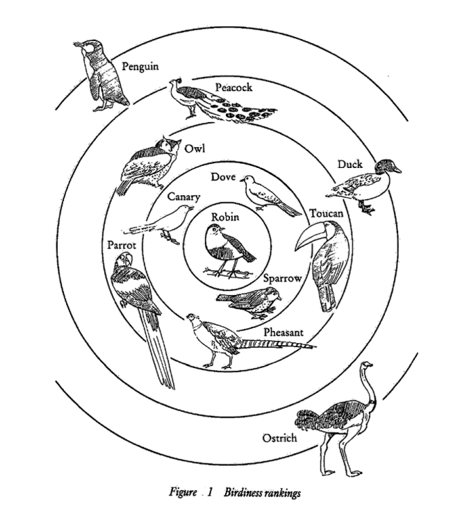- Il livello di base: i cui membri condividono il maggior numero di attributi distintivi del prototipo (uccello), è il più utile per la classificazione degli oggetti del mondo reale, perché a questo livello vengono fornite il maggior numero di informazioni.